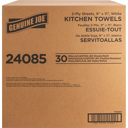 Perforated roll towels are environmentally responsible, Processed Chlorine-Free and made from a high percentage of post-consumer material. They exceed EPA comprehensive procurement guidelines and are whitened without chlorine. The two-ply towels fit standard kitchen-roll dispensers. Each roll contains 85 sheets.